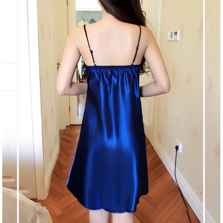 Sexy V-neck Women Satin Nightgown Knee Length Midi Slip Dress Smooth Ice Silk Lady Summer Thin Casual Sleepwear